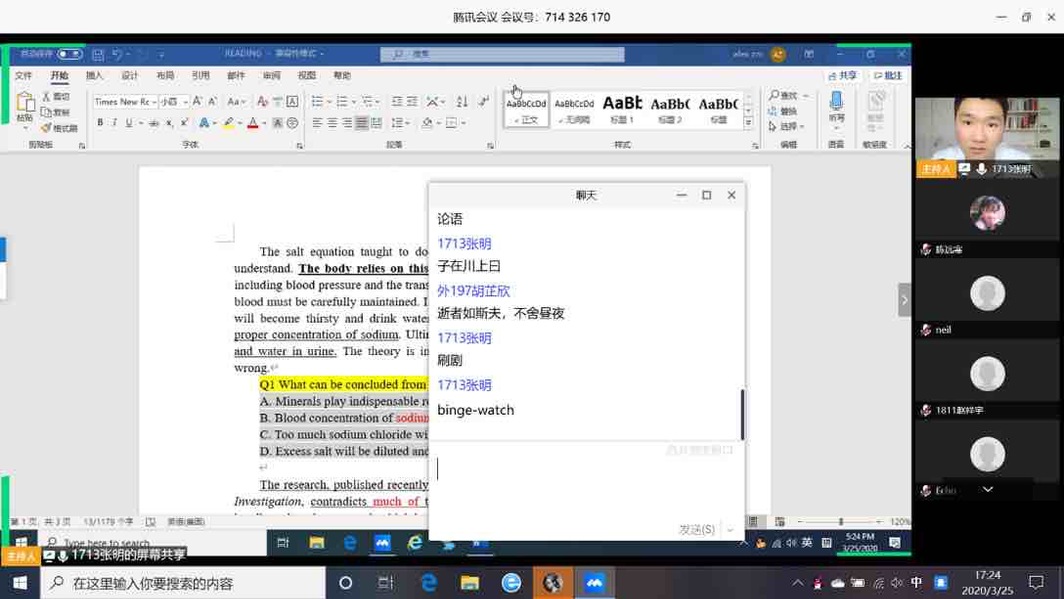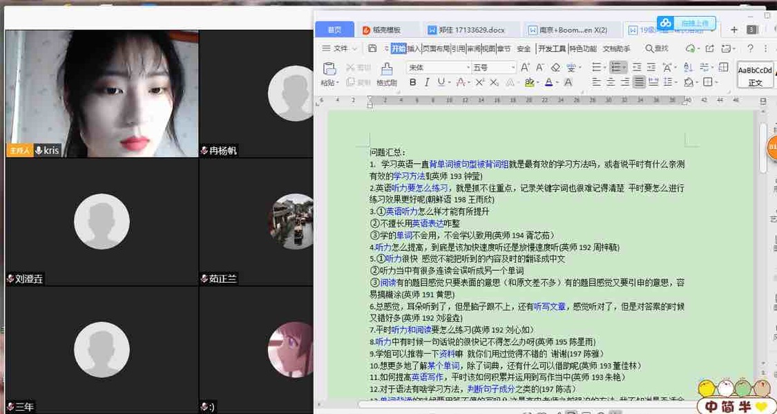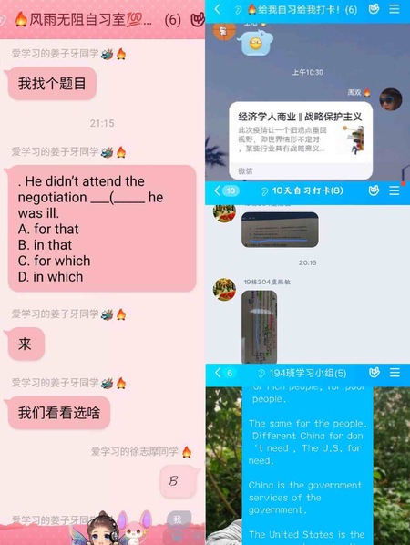 自学风“云建设”活动启动以来,学院号召同学们利用腾讯会议、QQ群、番茄“Todo”APP等平台,多渠道组建“云端自习室”和线上学习小组,邀请国家奖学金获得者、全国大学生英语竞赛一等奖获得者等学习榜样,开展以《专四ICU:完型+阅读主旨》、《英语学习:听说读写》、《考证那些事儿》为主题的线上答疑会、经验分享会,做好朋辈帮扶,营造浓厚学风,助力同学们尽快回归正常学习生活、摆脱学习困境、提高学习效率,以扎实的学业基础、饱满的精神状态迎接线下复学。