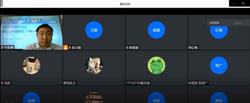 7月8日下午,我院特邀博士生导师和博士后合作导师、中国英汉语比较研究会常务理事、中国翻译协会翻译理论与翻译教学委员会委员、扬州大学翻译行为研究中心主任周领顺教授为我院师生和译界学者作了一场“理论、学习和研究:个案分析”的在线学术讲座。讲座由分管科研工作的于胜博副院长主持,我院师生与国内其他高校的学者共300人一起聆听了讲座。此次讲座,恰逢新冠疫情期间,副校长毕凤珊教授高度重视,会同我院姜海清院长等院领导,亲自部署,确保了我院本年度第一场学术讲座的成功举办。