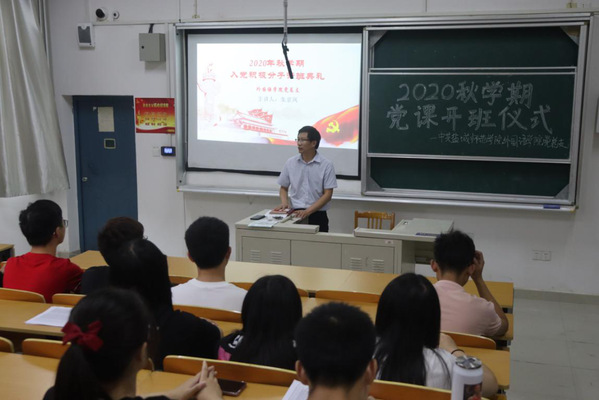 9月23日下午,william英国官网2020年秋学期入党积极分子培训班开班,党总支书记朱京凤出席开班仪式并主讲第一次党课《党的性质》,94名学生参加。