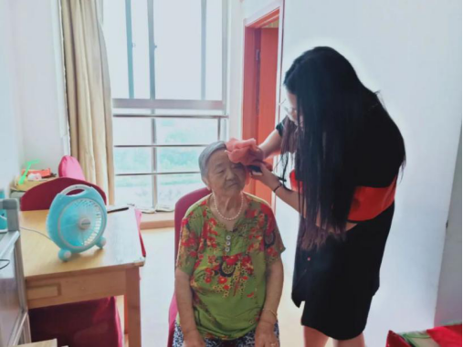 在志愿者们慢慢和老人们熟络开后,志愿者们开始为老人们耐心梳理头发,擦拭脸颊,做自己力所能及的事情温暖老人们的心。