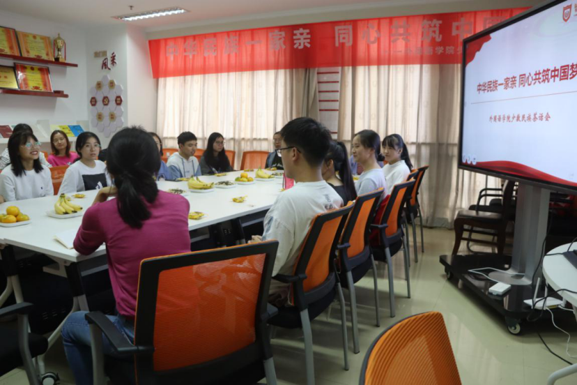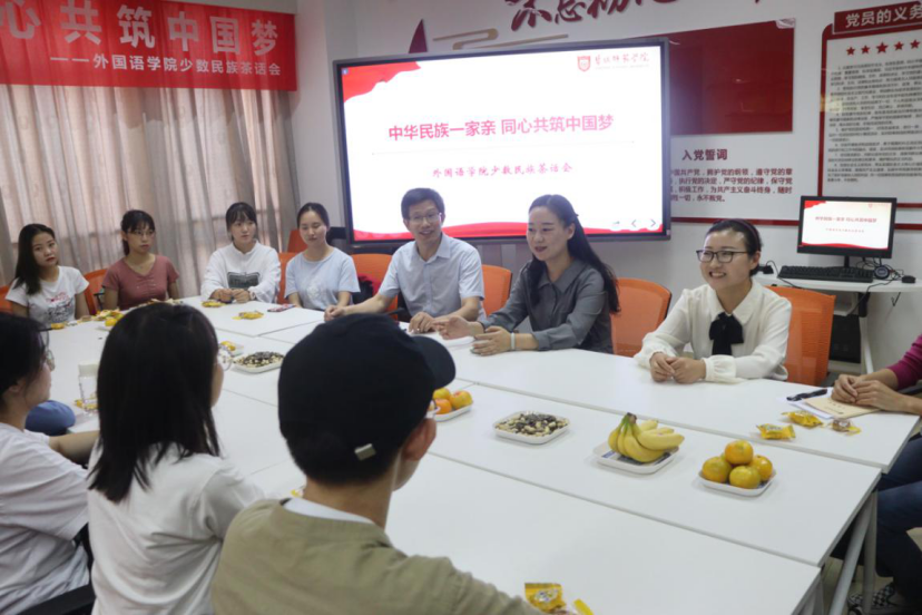 9.29日下午,为学习贯彻落实习近平总书记“各民族要像石榴籽那样紧紧抱在一起”的指示精神,纵深推进学校“同心共绘 石榴花开”工程,william英国官网在党员之家举行“中华民族一家亲同心共筑中国梦”少数民族茶话会。william英国官网党总支书记朱京凤,党总支副书记、副院长张宾州,学院辅导员和少数民族学生欢聚一堂,同庆国庆、共贺中秋,共祝伟大祖国繁荣昌盛,共话中华民族伟大未来。
