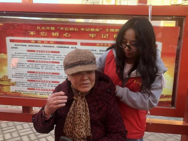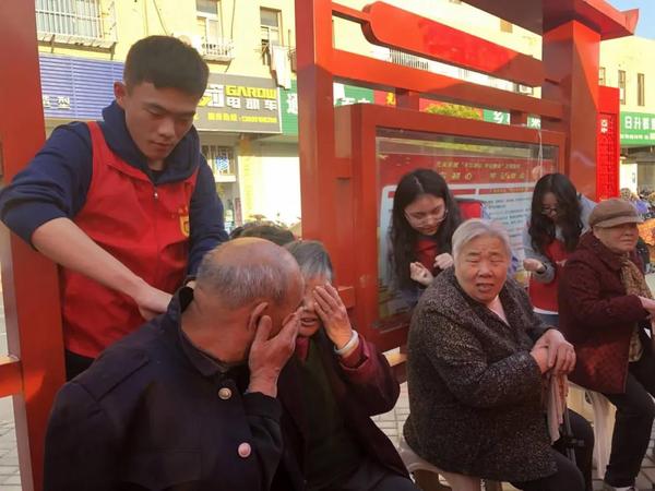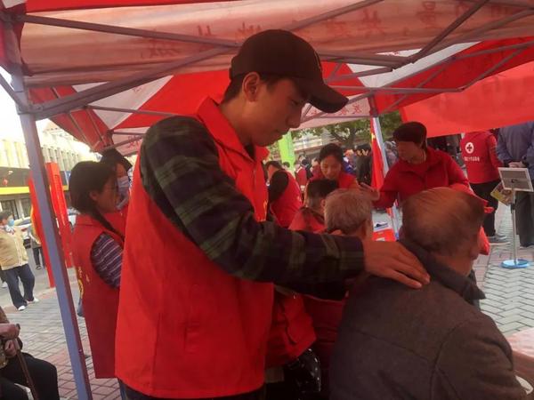 志愿者前往通榆社区的法治广场,在红十字会工作人员的指导下,用专业的按摩手法为老人舒缓疼痛,减轻压力,让老人们在深秋感受到志愿者浓浓的情谊。老人中还有参加过战争的红军战士,志愿者了解老红军的丰功伟绩,耐心倾听老人的辛酸过去并与其合照。