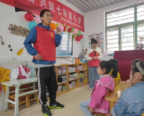 学院青年志愿者协会负责人蔡迪向到场幼儿园小朋友及社区留守儿童家庭介绍了“爱心课堂”基本内容,并代表服务团志愿者宣誓:我们将充分利用社会实践锻炼自身综合能力,并将专业知识和大爱精神毫无保留地传播给每一个孩子。