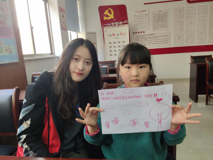 活动伊始,志愿者姜韵影先向小朋友介绍感恩节的由来发展、各地风俗等,借助外国感恩节的契机,培养小朋友的感恩意识,并通过英语视频动画的形式加深印象,引导小朋友们在学习英语知识的同时收获乐趣,寓教于乐。此外,志愿者特地邀请了小朋友的家长,活动过程涉及教授歌曲《感恩的心》手语动作以及为亲人捏肩捶背等,现场氛围一片融洽,小朋友积极配合;活动以志愿者引导小朋友为家人写一封感恩信结尾,小朋友用自己稚嫩的双手表达最纯朴的感谢。
