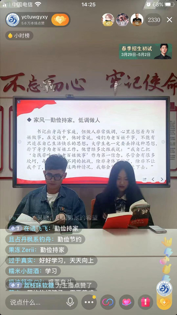 观看直播的师生纷纷表示,直播学习使内容更立体,气氛更浓厚,既接地气,又有人气。“平时看直播都是购买物质产品,这次直播竟然收获精神食粮,我真切感受到了人民领袖对青年一代的亲切关怀和殷切期望,为走好人生路指明了正确航向。”19(5)班高静雯说。
