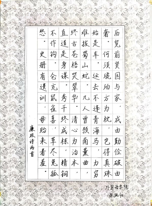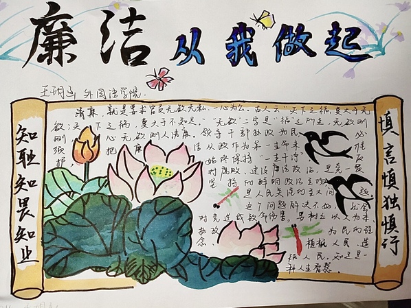 【书】5月9日,学院广泛开展“廉政之风进校园”手抄报字画征集活动,收集作品60余份。在作品展览中,同学们不仅感受到廉政文化的源远流长,也对反腐倡廉知识有了更深层次的了解。