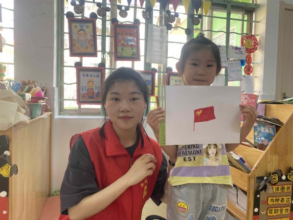 课堂伊始,志愿者袁宁遥向小朋友们介绍了党、党旗的由来和意义,引出课堂主题。接着,志愿者通过讲述简短、有趣的党史小故事“小萝卜头”“王小二”,小朋友们在志愿者的鼓励下表达内心感想,表现出对党的敬佩和热爱。简单地学习党史后,志愿者带领小朋友进行“正话反说”小游戏,小朋友积极参与游戏,谨慎思考、有序抢答,志愿者奖励糖果,现场氛围十分融洽。最后,志愿者指导小朋友绘画党旗,与展示成果的小朋友们合影。