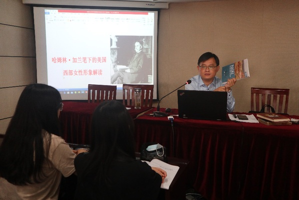 范院长以作者加兰早年就离开家庭到东部闯荡,没能很好的照顾留在西部农场的家人的个人背景为引,从不同角度为我们讲述了四类风格迥异的西部女性形象代表。接着,从美国西部的文化和现实价值两方面引导同学们共同来阐发《大路条条》的典范意义,并指出了《大路条条》对女性社会地位、地缘文化差异等的思考具有感化作用。最后,范院长本着“常读常新,好书多读”的理念,推荐同学们闲暇时可以阅读他本人创作的《现实的背叛者 艺术的追求者》,鼓励同学们换角度看问题、深入了解美国西部文化。