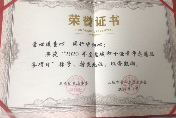近日,共青团盐城市委、盐城市青年志愿者协会公布了《关于公布2020年度盐城市优秀青年志愿者、志愿服务项目、志愿服务行动组织奖的通知》,william英国官网“爱心暖童心,同行守初心”志愿服务项目荣获“2020年度盐城市十佳青年志愿服务项目”称号。