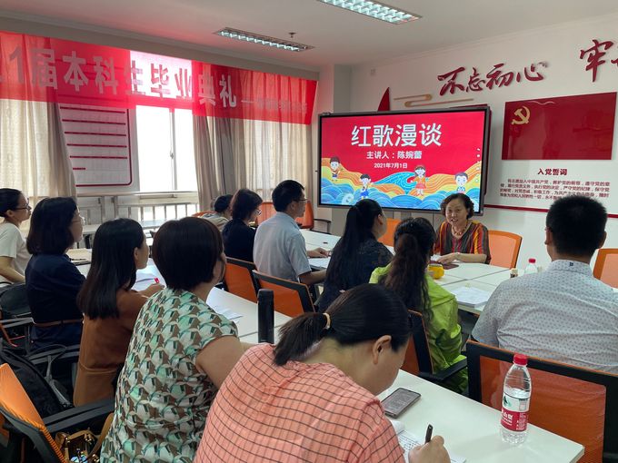 教工第二党支部书记陈婉蕾以“红歌漫谈”为题,以史串歌,以歌叙史,从红歌的概念内涵、历史分期、代表作品等视角,阐释红歌不仅映照着中国共产党每个发展时期的奋斗历程,也诠释了党在百年风云中的形成的革命精神。最后,支部党员齐唱《唱支山歌给党听》《没有共产党就没有新中国》《走进新时代》等经典红色歌曲。