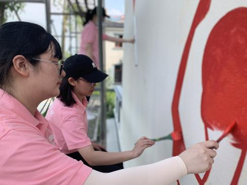 8月1日,团队成员早早来到绘画地,大家分工明确,清理场地,勾勒底稿,墙体上色,迅速进入工作状态。团队成员们在炎热的高温户外环境下一笔一画认真勾勒,大家排除一切困难,不懈努力,成功将绘画任务完成。