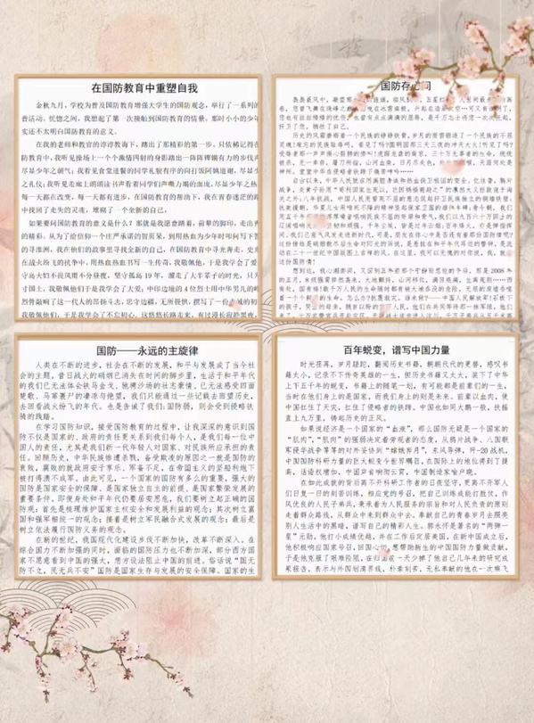 笔墨渲染,书家国万象。学院面向全体学生广泛开展“国防教育进校园”之书法作品、手抄报、电子海报征集活动。活动一经发出,大家积极反响,共收集作品60余份。在作品展览中,同学们不仅感受到书法艺术的源远流长,也对国防教育知识有了更深层次的了解。