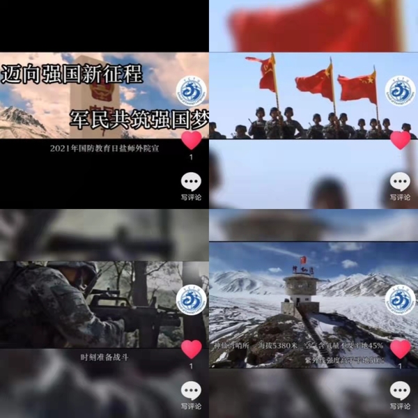 警钟长鸣,观国防风采。学院依靠官微、抖音直播平台,发布短视频进行国防教育宣传,同时各团支部带领班级同学观看升国旗的视频。通过动态内容的直观学习,同学们纷纷表示,哪有什么岁月静好,只不过是有人替你负重前行。努力学习,锤炼本领,才能不负先辈,不负盛世。