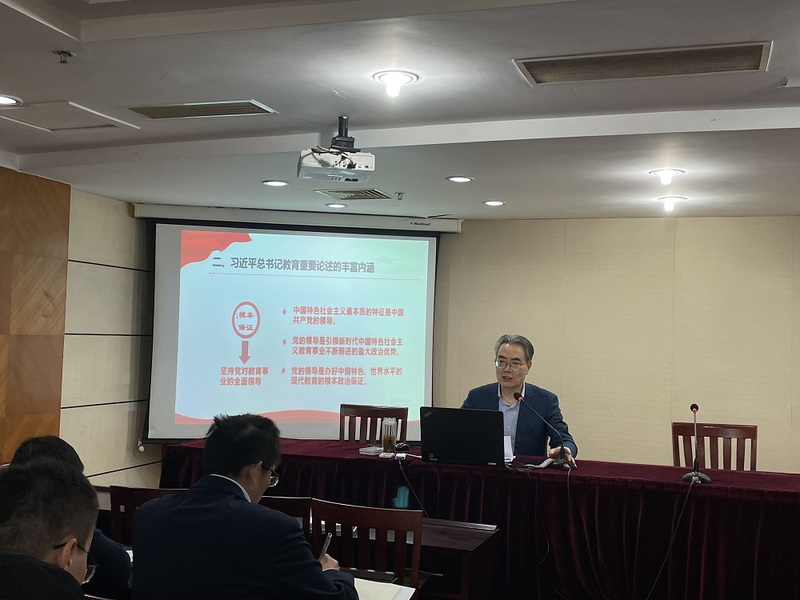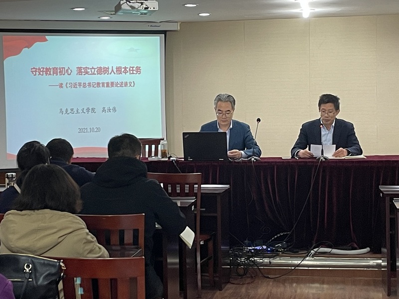 高汝伟结合我国教育发展现状和我校实际情况,从政治保证、根本任务、根本战略、根本方向、根本道路、根本追求、根本动力、根本使命和根本依靠等九个方面阐述了习近平总书记教育重要论述的丰富内涵。他强调指出,立德树人是高校的立身之本,学校要坚持以人民为中心发展教育,建设高素质教师队伍,构建德智体美劳全面培养的教育体系,形成更高水平的人才培养体系;高校教师要坚定理想信念、厚植爱国情怀、涵养高尚师德,做“四有”好老师,赓续百年初心,担当起育人使命。