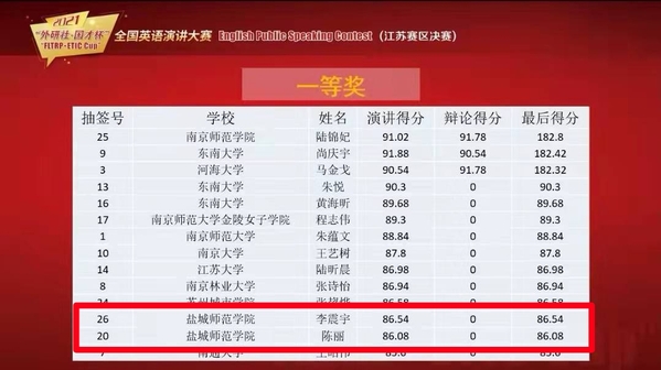 2021年“外研社·国才杯”全国英语演讲大赛江苏赛区决赛落下帷幕。我院学子发挥出色,斩获2项一等奖的好成绩,获奖情况创历史最佳,在同层次高校中位居前列。