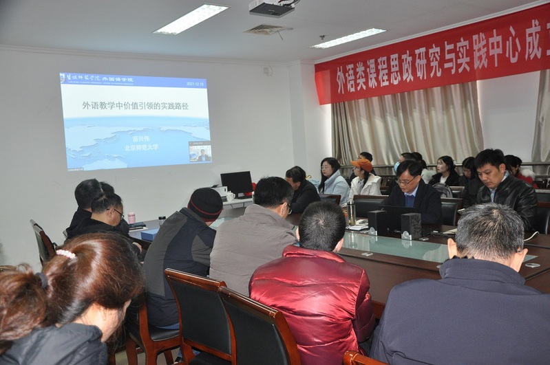 成立仪式后,中心召开了首次研讨会,北京师范大学外国语言文学学院院长、博士生导师苗兴伟教授做题为“外语教学中价值引领的实践路径”的专题讲座,讲座由院长范能维主持。苗兴伟教授从外语课程思政的内涵与逻辑、价值引领的实践路径、价值引领的内容激活等三大方面系统阐述了在课程思政背景下,外语教学在传授外语学科知识和培养跨文化交际能力的同时,帮助学生树立正确的世界观、人生观、价值观的重要性。他指出外语课程是外语课程思政建设的基本载体,价值引领是外语课程思政建设的灵魂。苗兴伟教授以大学英语和中学英语单元教学为例,详细讲解了如何以语篇为依托,通过单元整体设计,融入德育元素,在主题意义探究中促进价值塑造、知识传授和能力培养的有机融合,从而实现英语教学的价值引领。