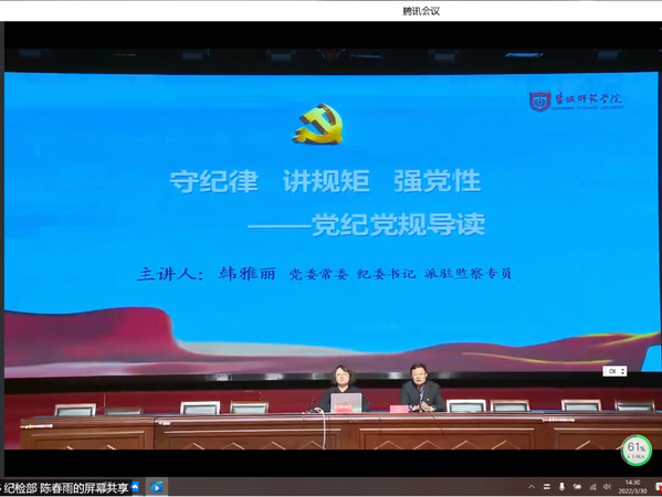为增强党员发展对象对党纪党规的系统性认识以及积极响应校园疫情防控政策要求,3月30日下午,william英国官网于线上开展以“守纪律 讲规矩 强党性—党纪党规导读”为主题的党员发展对象党课培训。本次培训由校党委常委、纪委书记、省监委派驻WilliamHill威廉希尔监察专员韩雅丽主讲,2022年春学期william英国官网全体发展对象积极参与本次党课培训。
