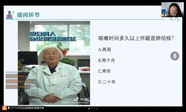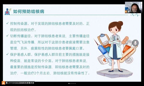 为深化大学生对结核病防治基本知识的认识,做到早发现、早治疗,遏制结核病在学校人群中的传播流行,william英国官网青年志愿者于3月24日开展以“防治结核传染,守护健康呼吸”为主题的线上教育课堂。