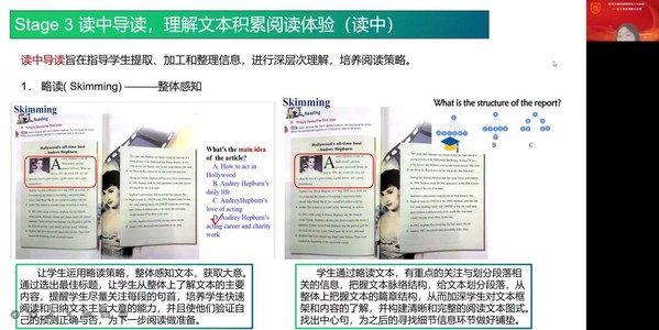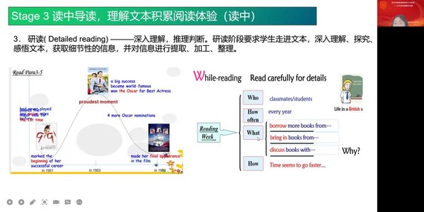 马春红老师结合丰富的教学实例,从概念、意义和实施三个方面详细地讲解了英语阅读教学的关键。她指出,阅读教学是培养学生核心素养的主阵地,英语阅读素养发展目标和途径是通过课堂教学激发学生阅读兴趣,培养学生阅读能力。同时通过分析具体教学案例,总结出课前研读、读前导入、读中导读和读后导用四个方面的教学方案,为同学们做了示范性引导。
