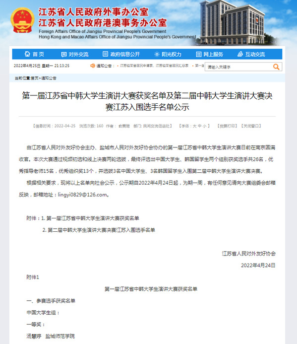 据悉,今年是中韩建交30周年,本次大赛自今年2月启动以来,得到了全省中韩大学生的积极响应,受到了江苏省人民政府外事办公室官网、江苏一带一路网、交汇点新闻网、盐城发布等媒体的广泛关注,有力提升了我校专业建设的影响力和品牌效应。