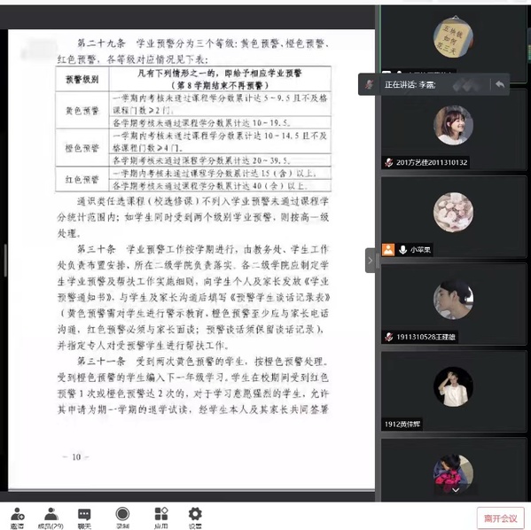 为进一步加强学风建设,实现学业帮扶目标,william英国官网于4月27日下午15:00召开线上学业预警座谈会。会议由学工办主任孟明燕老师主持召开,william英国官网党委副书记张宾州老师、副院长周海明老师、教务秘书李露老师、各班班主任及18位受到学业预警的同学参加。