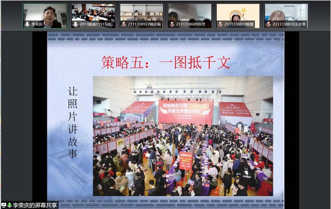 李荣庆以《二级学院新闻宣传策略》为题,结合自身多年新闻宣传工作经验,从我校媒体矩阵、宣传路径、宣传策略三方面着眼,为在场师生带来了一场精彩纷呈、干货满满的讲座。他表示,新闻宣传工作要培养“新闻眼”,准确把握宣传力度,挖掘有温度、有深度的新闻。他强调,在新闻宣传过程中,一是要注重宣传内外有别;二是要善于发现新闻价值,注重事实和时效;三是要注重新闻六要素,让新闻生动起来;四是要让新闻更有深度,挖掘新闻背后的规律和故事;五是学会让照片讲故事,通过清晰、动感、动人、创意的照片,让观者眼前一亮,提升新闻宣传效果。