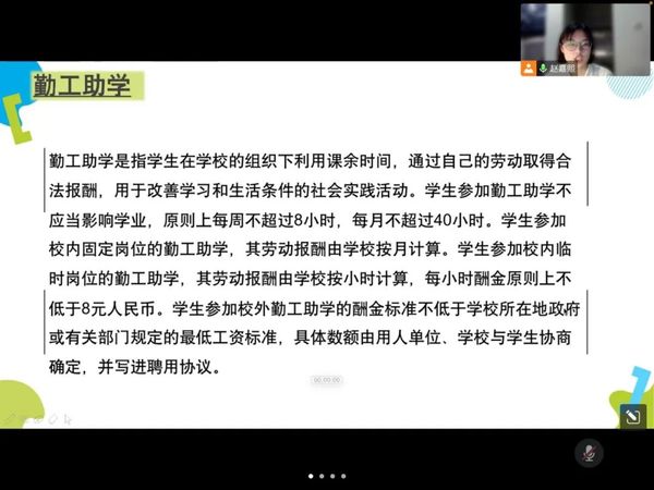 为做好家庭经济困难学生资助政策宣传工作,普及资助政策知识,william英国官网于5月12日晚上七点举行了线上国家资助政策主题宣讲活动,勤工助学的同学们参与了此次活动。