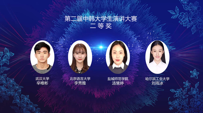 第二届中韩大学生演讲大赛作为中韩建交30周年系列纪念活动之一,自今年4月正式启动以来,吸引众多中韩两国大学生积极参赛。经北京、江苏、山东、湖北、陕西五个分赛区的选拔比赛,来自北京大学、南京大学、中国海洋大学、西安外国语大学等院校的30名选手入围全国总决赛。我校朝鲜语专业学生汤慧婷最终以韩语组第二名的优异成绩,夺得全国总决赛二等奖。