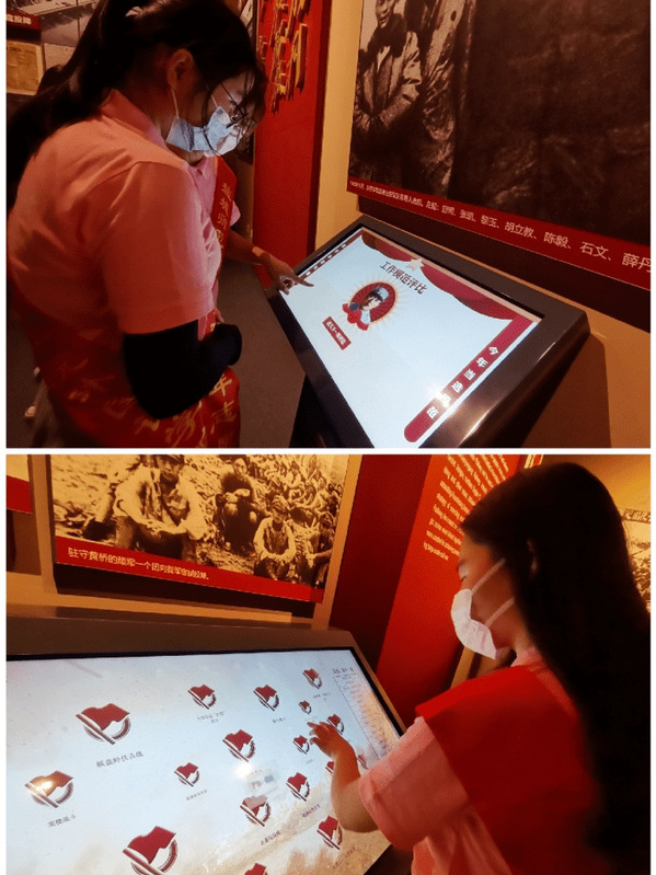 志愿者先参观了展厅,欣赏了新四军在华中地区持续八年敌后抗战的1000多张照片、大批文物史料及发绣、铁画、泥塑、油画等文艺作品。其中“进军华中,开辟敌后抗日战场”、“坚持抗战,纵横驰骋江淮河汉“的动态模拟景象令人震撼。