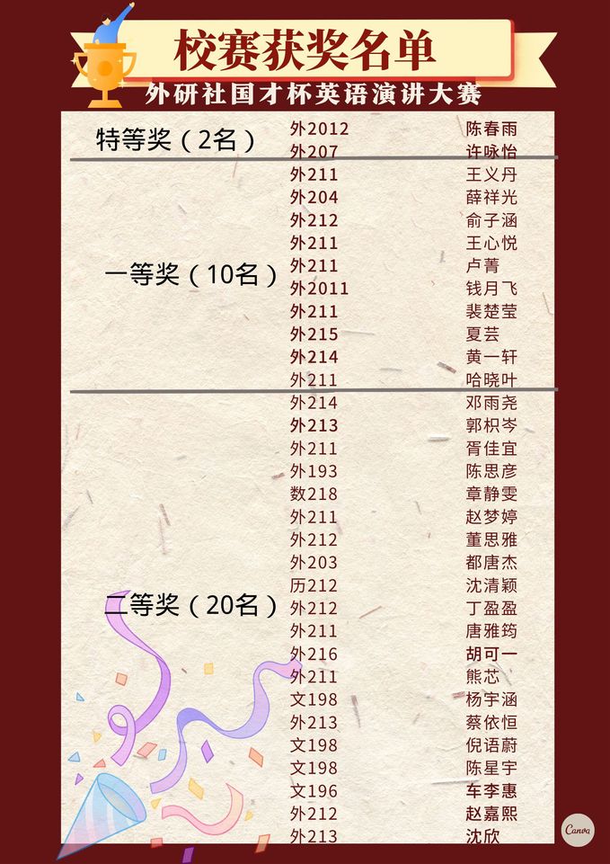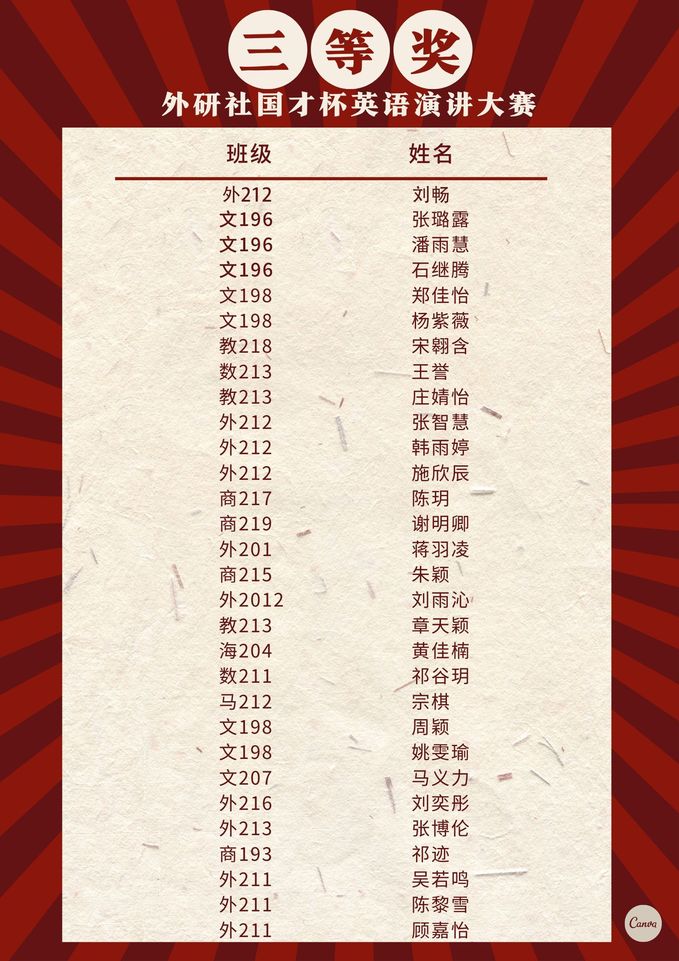 本次决赛以“China's Wisdom for the World”为主题,经过前期初赛选拔,共有32名选手脱颖而出进入决赛。决赛分为演讲和提问两个环节,要求每位选手根据规定主题在三分钟内进行脱稿演讲,随后回答现场提问。赛场上,参赛选手精神饱满,发音纯正标准,表现赢得了在场师生的阵阵掌声。评委根据选手的演讲内容、语言表达和整体表现进行现场打分。经过激烈角逐,最终评选出特等奖2名,一等奖10名和二等奖20名。