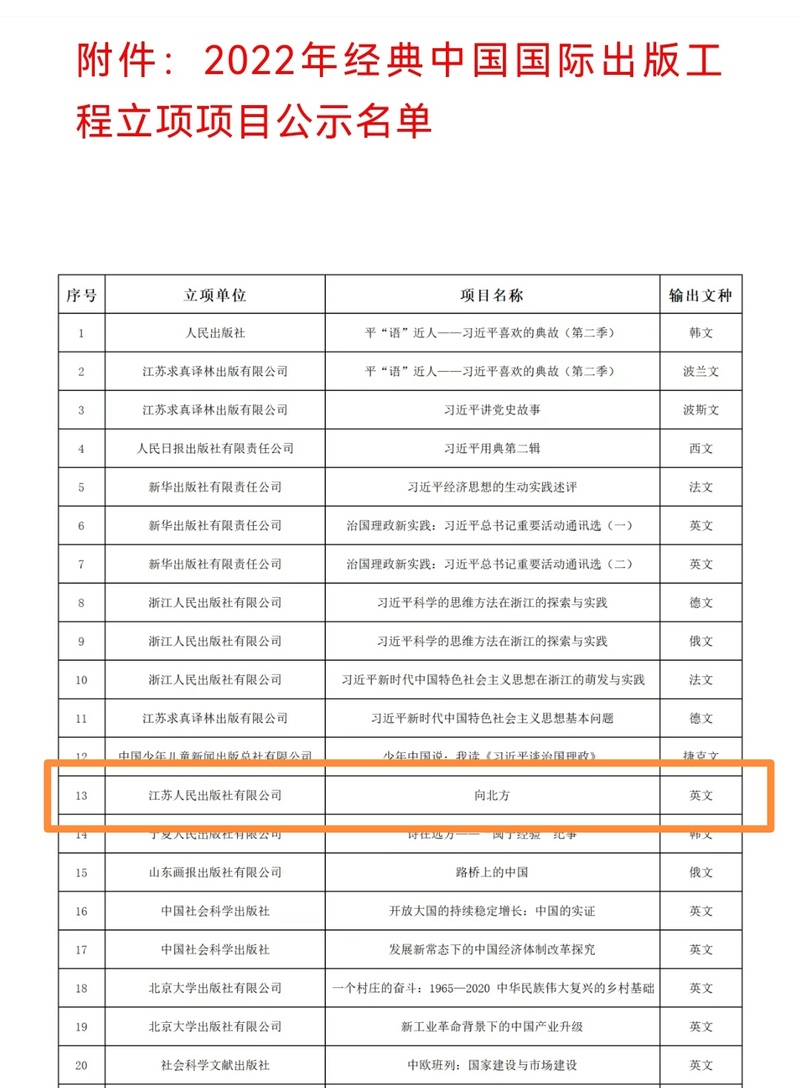 江苏人民出版社出品的《向北方》荣获2021年度“中国好书”。该书全景式展现了在新中国成立前期,进步民主人士和各界代表由香港前往北方解放区筹建新中国的非凡故事。