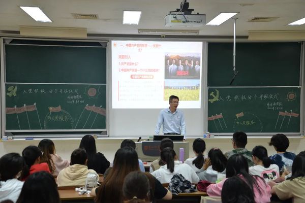接着,朱书记开展了以“中国共产党的性质、宗旨与指导思想”为主题的党课。他从“党是什么”、“入党干什么”、“以什么作为行动指南”三个方面,结合中国共产党的发展历程,指出人民民主专政制度的优势,全面阐述了党的先进性与特质,让同学们深刻认识到中国共产党为什么能、马克思主义为什么行、中国特色社会主义为什么好,进一步筑牢对党忠诚的政治品格。