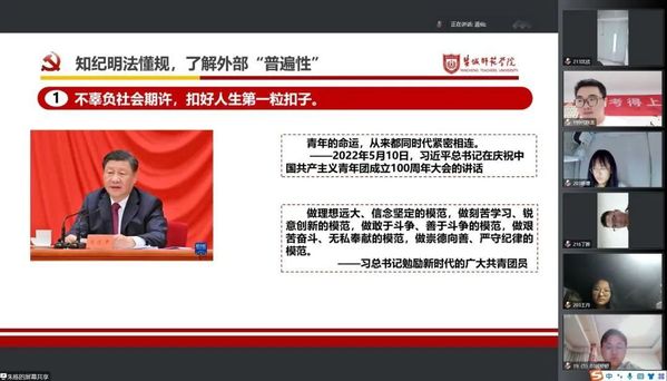 活动过程中,张书记通过回顾近代哲学对“自由”概念的解析,讲述了自由之为自由不是排除一切外部权威和干涉,也不仅仅限于“人为自身立法”,而是人们应在自己特殊的私己的倾向中,经由反思真正把握外部“普遍性”,并且站在超越个体特殊性的外在普遍性的高度,使自己对自身行为的理性规定与外部的普遍规定趋同,即使自身的理性规定在外部获得实际、客观的内容,进而能够安放好自身与他人共在的关系。随后,张书记通过对习近平新时代中国特色社会主义思想以及《党章》《中国共产党纪律处分条例》《新时代中小学教师职业行为十项准则》等解读,结合警示教育典型案例,强调了党的政治纪律、组织纪律、廉洁纪律、群众纪律、工作纪律和生活纪律六类纪律红线,引导同学们要做到知纪明规懂法,明确“真自由”的边界,告诫同学们切忌将“自由”沦为“放任”,使自己沦为“欲望”的奴隶。最后,张书记号召同学们扣好“扣子”守好“法”,争做党纪法规宣传员、遵纪守法示范员以及纪法执行监督员,不辜负社会期许,不辱青春使命,实现真自由。