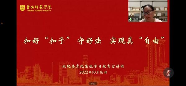为深入学习贯彻全面从严治党和依法治国重大决策部署,落实学校纪委进一步强化全校大学生纪法意识和廉洁意识,营造风清气正的校园氛围要求,10月16日晚,william英国官网党委副书记张宾州面向学院学生党员、2022年秋学期全体入党积极分子、2022届师范类毕业生以及部分团员代表作了题为“扣好‘扣子’守好法,实现真自由”的党纪法规宣传教育讲座。