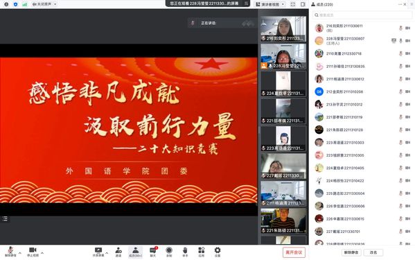 10月23日下午,学院于线上开展了党的二十大精神知识竞答活动。“全面建设社会主义现代化国家的首要任务是什么?3、2、1,开始抢答!”“高质量发展”……云端会议室的气氛紧张而热烈,一场以“感悟非凡成就 汲取前行力量”为主题的知识抢答赛如火如荼进行,随着参赛的18支队伍544名选手一轮又一轮精彩激烈的答题,赛场的气氛被不断推上新高潮。经过近1个小时的激烈角逐,最终评出一等奖3名,二等奖6名,三等奖9名,在对获奖队伍进行表彰后,本次抢答赛圆满落下帷幕。本次竞赛旨在通过以赛促学、以学促行、比学赶超的方式,推动全院学生深刻领会党的二十大提出的新思想、新判断、新目标、新举措、新要求,以更加昂扬的姿态奋进新征程、建功新时代。