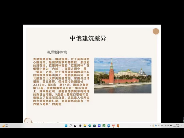 本次活动,李晗菲同学通过精美的ppt、有趣的视频以及自己生动的讲解,从饮食、服装、建筑等多个方面带领同学们欣赏了中俄文化间的共性以及各自的特点。同学们对于俄国的文化表现出极大的兴趣,热烈的讨论点燃了现场的气氛,在讲到本国文化时尤其表现出强烈的自豪感。在探寻中俄文化的联系中,同学们也增强了民族自信心以及对俄语学习的兴趣。