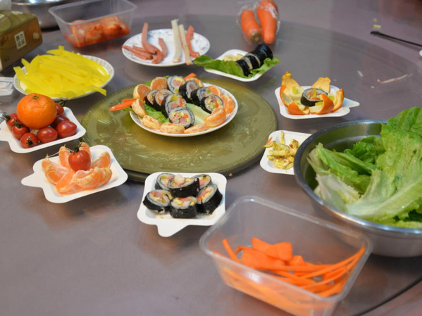 活动内容有趣,过程妙趣横生,参与的同学近距离感受到了韩国传统饮食文化。从原材料的准备烹饪,到制作的各个步骤,最后紫菜包饭完美地呈现在眼前,同学们高度自主完成了紫菜包饭的制作。在制作过程中,老师们来到活动现场,与同学们一起参与紫菜包饭制作活动,画面温馨美好。