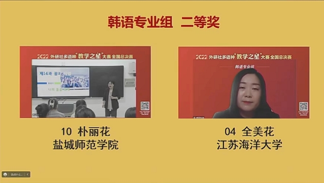 2022年12月17日8:20-12:20,由北京外国语大学中国外语与教育研究中心、北京外国语大学中国外语教材研究中心、外语教学与研究出版社主办的多语种“教学之星”大赛韩语专业组全国总决赛成功落下帷幕,我院朝鲜语专业教师朴青梅获韩语专业组全国总决赛一等奖,朴丽花获二等奖。