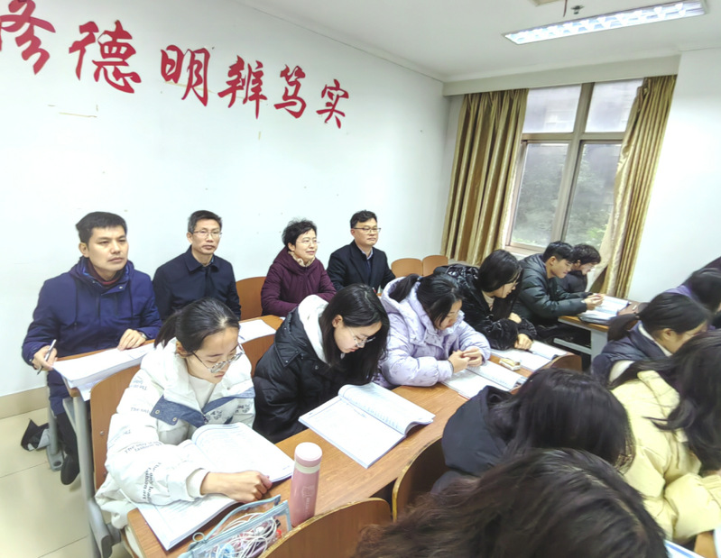 毕凤珊一行在主楼A105、A103陆续听取了买春艳老师和王黎丽老师讲授的《大学英语2B》,课堂上,领导们仔细观察学生的听课情况,不时记录下教师的教学内容和听课感受。课后,领导们与授课教师亲切交谈,对改进课堂教学、提高教学质量提出了指导性意见。各系主任与学院督导组成员也分头开展了听课活动。