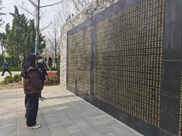 下午三时,11名志愿者神情肃穆地走进陵园。时届清明,翠柏凝春,志愿者穿过林间小道,怀着沉痛的心情认真研读黑色大理石碑上镌刻的烈士英名录,密密麻麻的金色刻印昭示着战争的惨烈与战士的无畏。