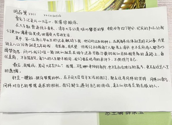 主持人在活动中向同学们阐述了“大学”的含义。通过播放纪录片《大学 The Great Learning》的精彩片段,主持人向大家展现了四位有着不同的人生际遇,却都拥有着忘我奉献、执着奋进精神的清华人。观影后,同学们纷纷写下自己对该影片的感悟并与大家进行了分享。