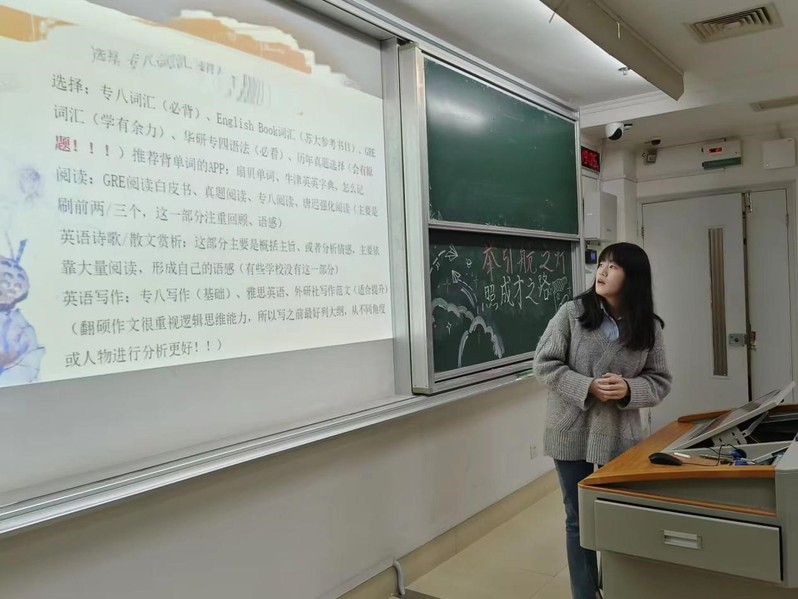 “研途有你,砥砺前行。”外院自律会就业服务部于4月24日在主楼A301教室举办了一场考研经验交流分享会。邀请了考取江南大学学科英语专业的程梦梦进行考验分享,她分享了考试科的备考方法,同时还向我们推荐了一些题库和网课资源,条理清晰,干货满满,最后全体同学纷纷鼓掌。