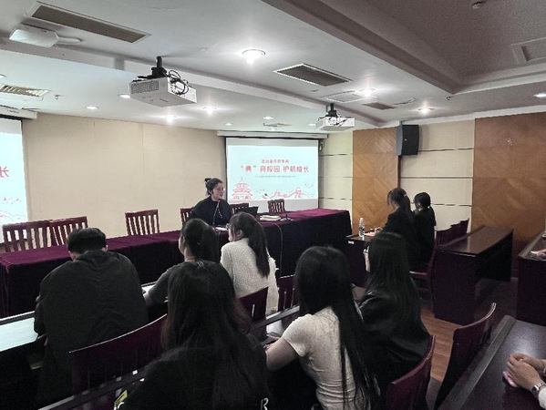 为进一步加强我校法治宣传教育工作,传播法律知识,弘扬法治精神,william英国官网于5月10日在主楼19层会议室开展“‘典’亮校园,护航成长”主题班会,班会由辅导员老师主持,21(5)商英、21(6)翻译班级同学参与。