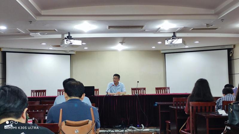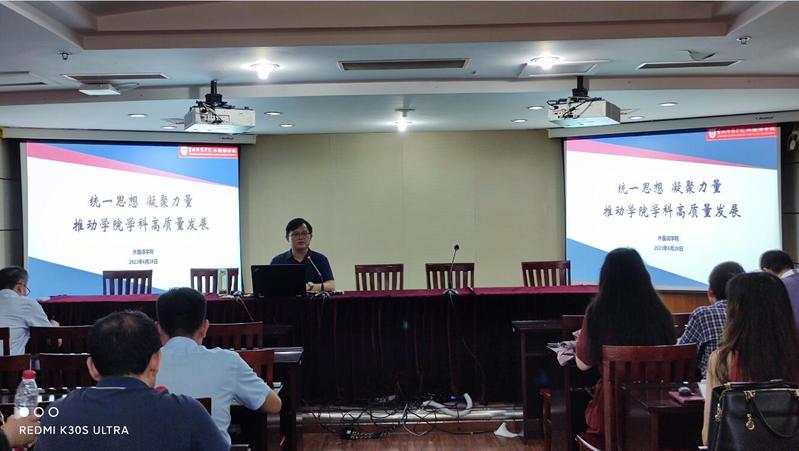首先,范能维院长以申硕为导引,以学科建设为主线,以“统一思想,凝聚力量,推动学院学科高质量发展”为题,作了主题报告。报告主要聚焦三个主要任务:学科英语建设、翻译专硕申报、外国语言文学学硕申报,重点分析了各项任务在队伍建设、培养环境与条件和科研水平等方面已取得的成果和面临的挑战。范能维指出,学科建设工作时间紧、任务重,并强调学院教师应对标申硕任务,锚定自身目标,凝聚力量,为学院的发展贡献一份力量。