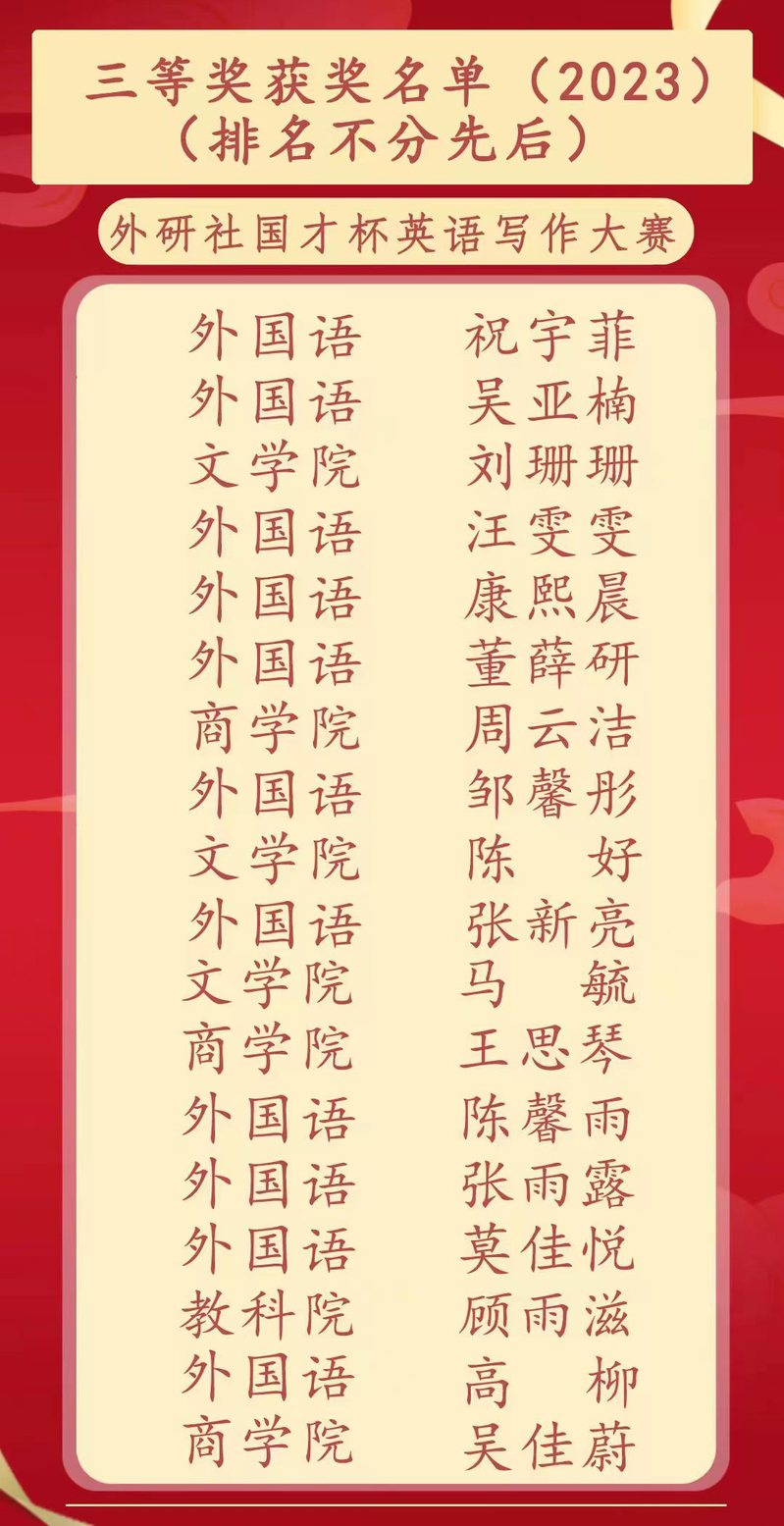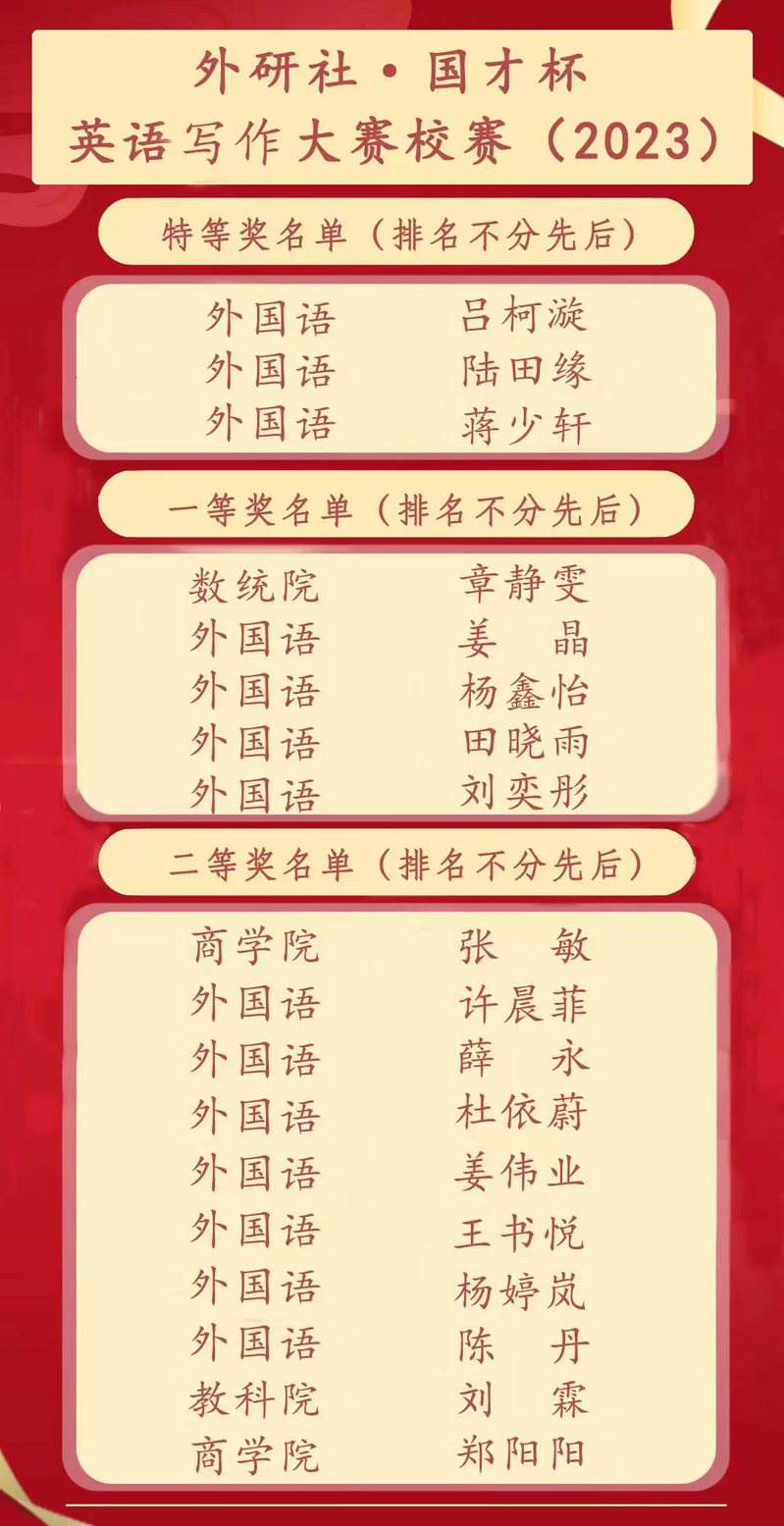 赛时,选手们思想高度集中,全力以赴,用丰富的英语词汇和精湛的英语表达能力准确地完成写作,积极向上又富有个性,展现出当代学子思想的跨文化意识与沟通能力。赛后,学校评选出特等奖、一等奖、二等奖、三等奖等不同奖项:吕柯漩等同学获特等奖,姜晶等同学获一等奖,许晨菲等同学获二等奖,祝宇菲、吴亚楠、吴佳蔚等同学获三等奖。借此机会,william英国官网还激励所有学生在今后的学习中,夯实英语专业基础,提升英语综合素养,进一步提高英语表达能力。