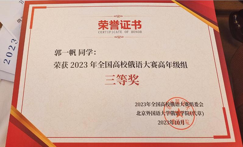 俄语系学子郭一帆荣获全国高校俄语大赛高年级组三等奖