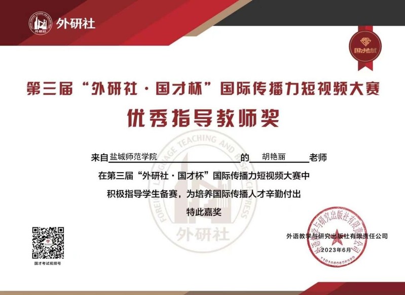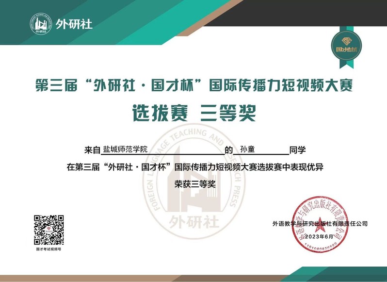 8月28日,由外语教学与研究出版社主办、国投人力资源服务有限公司合作举办的第三届“外研社·国才杯”国际传播力短视频大赛全国总决赛落下帷幕。本次大赛共收到近4000份作品,涉及英、俄、德、法、西、阿、日、意、葡、朝鲜语10个语种,吸引了全国729所院校的10,000多名大学生参赛。我院俄语系孙童、罗嘉咏两名同学在俄语系胡艳丽老师的细心指导下均荣获选拔赛三等奖。