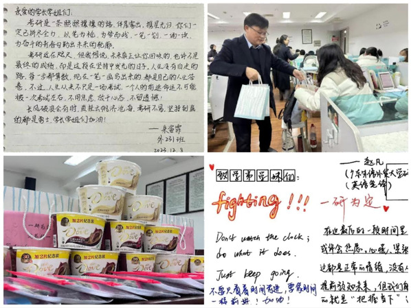 研途漫漫,从不孤单。william英国官网在考前为全体考研学子准备了“一举夺魁”考研暖心加油包——精致的贺卡寄满祝福、美味的德芙巧克力补充能量、考研必备文具作充分保障,为大家稳心态、增信心、添动力,相信每位学子都能在这份考研大礼包中感受到学院和老师们美好的祝愿和亲切的关怀。同时,学院的毕业生和在校生都为考研同学的最后冲刺加油打气。