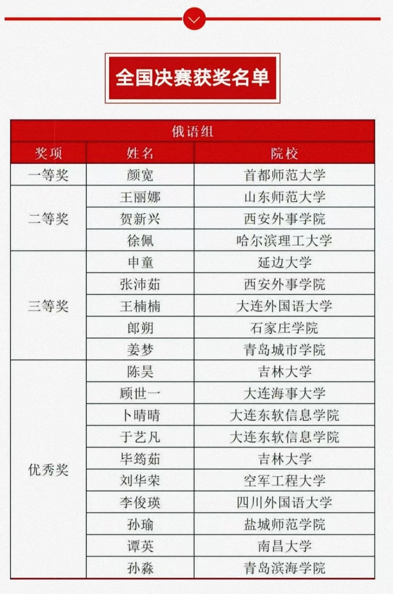 近日,由北京外国语大学中国外语与教育研究中心、北京外国语大学中国外语教材研究中心、北京外国语大学中国外语测评中心和外语教学与研究出版社共同举办的2023外研社多语种"教学之星"大赛圆满落下帷幕。大赛自启动以来,全国共有116所高校197位参赛教师进入决赛。我院俄语系教师孙瑜荣获俄语专业组优秀奖,位列全国第17名。