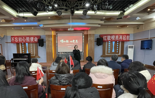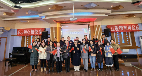 在《没有共产党就没有新中国》《我和我的祖国》歌曲合唱中,全体教师自发进行了跟唱,现场气氛推向了高潮。歌声在活动中心回响,大家挥舞着手中小国旗感动在其中。
